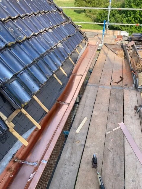 De oude dakgoten zijn eerst verwijderd en daarna zijn de nieuwe gemaakt en geplaatst. Het gaat hier om ongeveer 14 meter dakgoot.